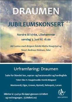 Søndag 3. juni urframfører koret Ad Cantus og spillemann Sivert Andreas Holmen min nye suite for kor og hardingfele "Draumen", med fem sanger til tekst av Olav H. Hauge. Dirigent er Ashild Alette Haugstad, og konserten er i Nordre Ål kirke, Lillehammer.